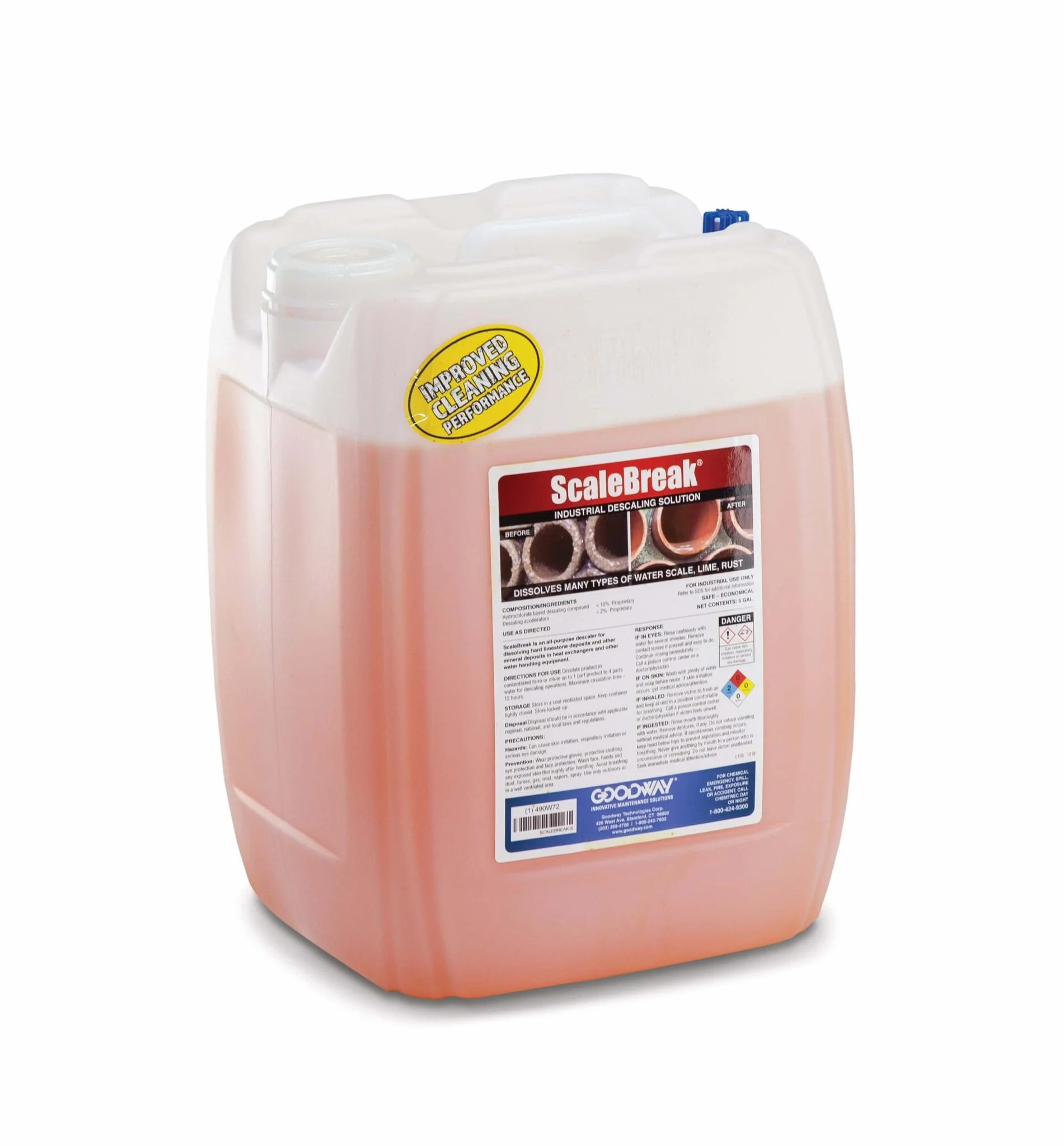 ScaleBreak de Goodway® est un mélange polyvalent unique d’acide chlorhydrique (HCL) enrichi d’agents mouillants et pénétrants puissants à faible mousse et d’inhibiteurs de corrosion supérieurs. Il est conçu pour détartrer une large gamme de métaux et d’autres matériaux, mais il ne convient pas à l’acier inoxydable. ScaleBreak offre d’excellents résultats de nettoyage et une grande rapidité sans compromettre l’intégrité à long terme des métaux de base des équipements. La solution de détartrage biodégradable dissout en toute sécurité les dépôts de tartre en une suspension liquide et permet de les évacuer des échangeurs de chaleur, sans laisser de solution résiduelle.