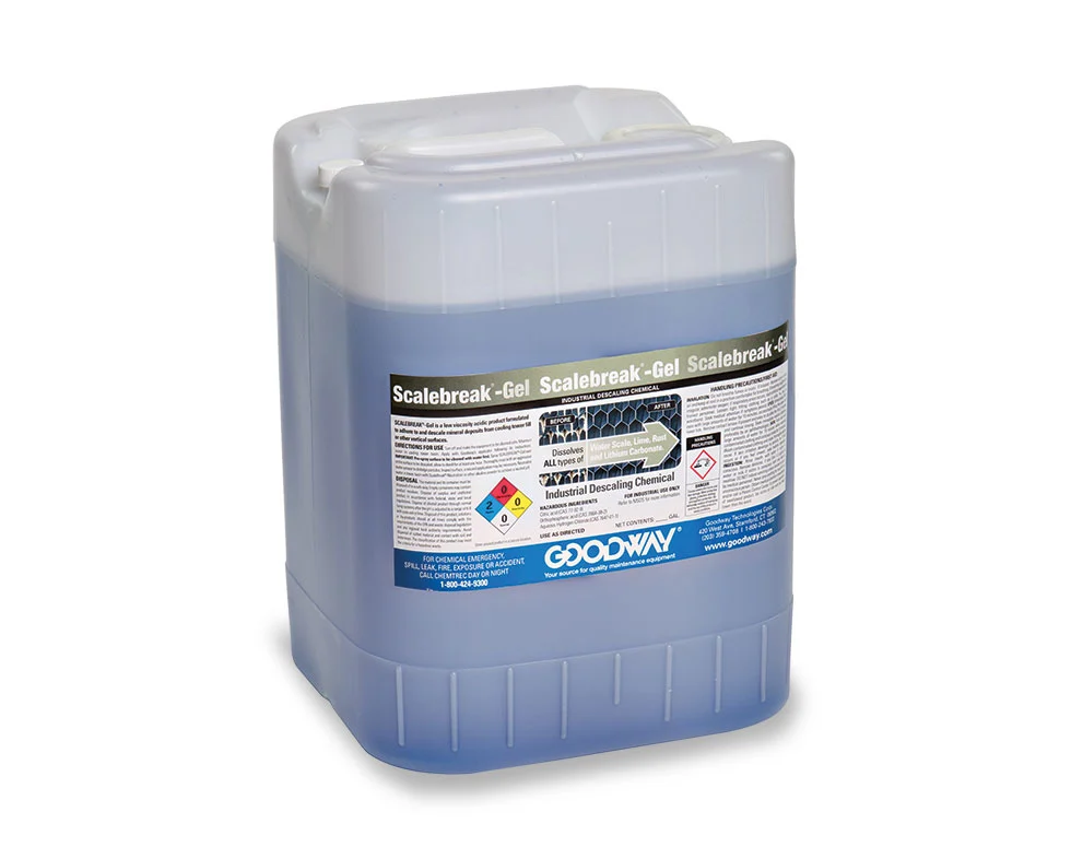 Goodway® ScaleBreak-gel est spécialement formulé pour nettoyer le garnissage des tours de refroidissement et autres surfaces verticales. Ce gel acide à viscosité élevée adhère aux surfaces pour éliminer efficacement les dépôts minéraux et le tartre. En éliminant l’accumulation, il améliore non seulement l’apparence de la tour de refroidissement, mais réduit également les zones où des bactéries nocives, telles que la Legionella, peuvent proliférer. Un nettoyage régulier avec ScaleBreak-gel améliore à la fois l’efficacité et l’hygiène globale de la tour de refroidissement.