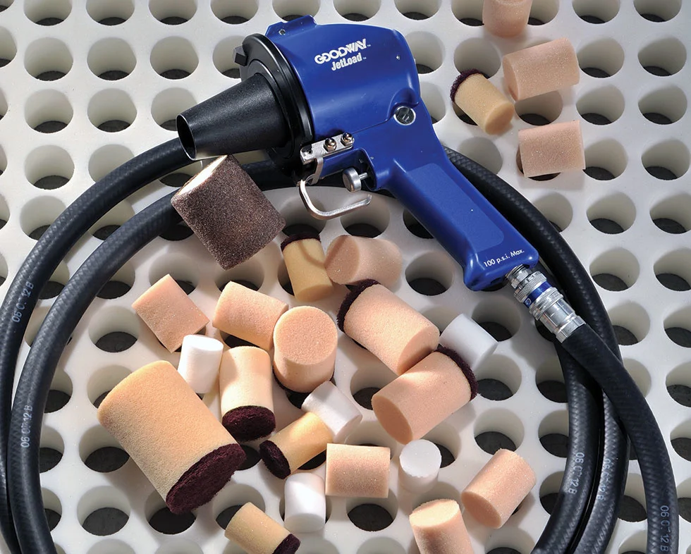 Le nettoyeur de tubes Goodway® Jetload est un système polyvalent principalement utilisé pour éliminer les fluides ou les résidus de produits des tubes d’échangeurs de chaleur, des tuyaux et des conduites. Le système utilise de l’air comprimé pour propulser des projectiles en mousse spécialisés surdimensionnés à travers les tubes. Grâce à leur taille relativement supérieure par rapport au diamètre intérieur du tube, les projectiles expulsent efficacement tous les dépôts ou fluides. Le nettoyeur de tubes Jetload est facile à utiliser et convient aux tubes droits et courbes avec des diamètres intérieurs allant de 5 à 51 millimètres.