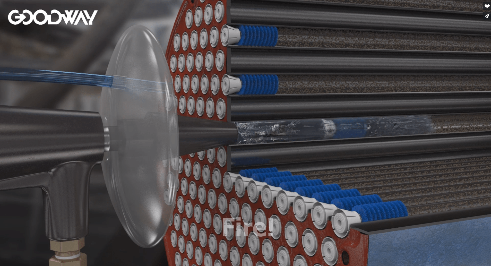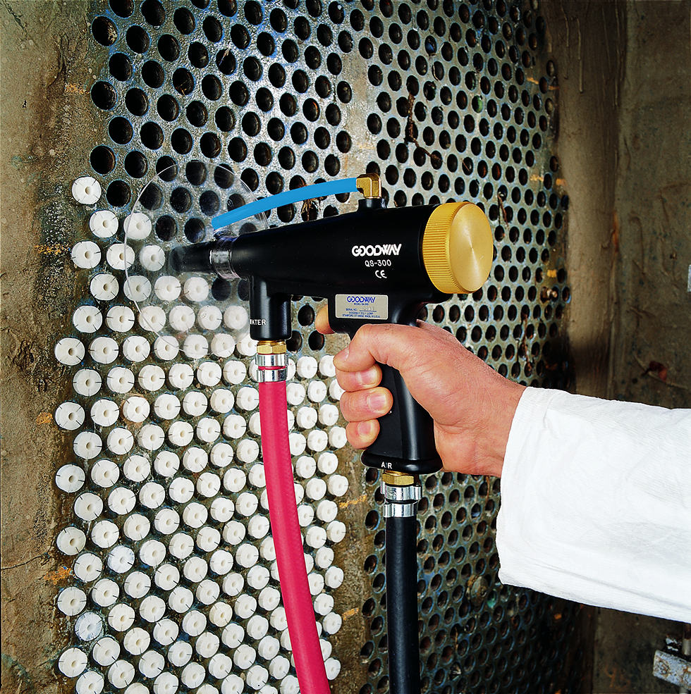 Le Goodway® QS-300 quick shot est conçu pour nettoyer de grandes quantités de tubes d’échangeur de chaleur et de condenseur droits et lisses, tels que ceux que l’on trouve dans les condenseurs de surface des centrales électriques. Le système combine la pression d’air avec l’eau basse pression pour propulser des projectiles spéciaux à travers les tubes en quelques secondes. Ces projectiles éliminent efficacement les dépôts des parois des tubes en les grattant et en les poussant vers l’extérieur, améliorant immédiatement le transfert de chaleur et l’efficacité globale – sans risquer d’endommager les tubes.