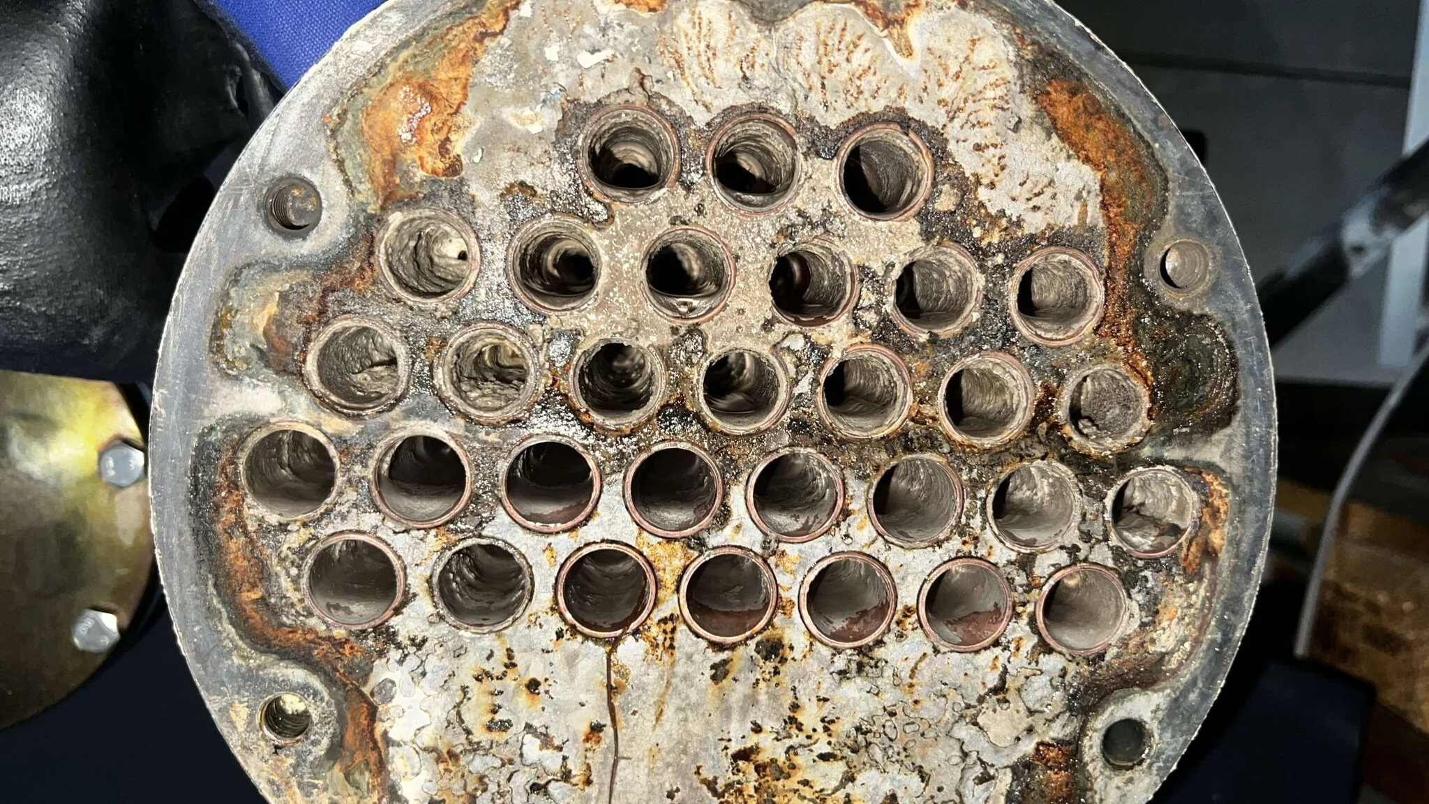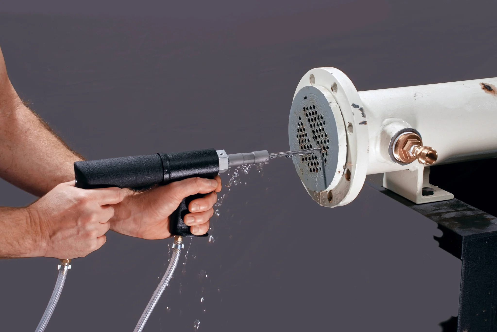 Lorsque des dépôts formés par l’eau dure, tels que le carbonate de calcium, bloquent complètement les tubes d’échangeur de chaleur, le système de perçage Goodway® PSM-500 est l’outil idéal pour restaurer la capacité de débit. Bien que le PSM-500 rouvre les tubes, il ne nettoie pas complètement les surfaces internes. Pour des résultats optimaux, un processus de nettoyage en deux étapes est recommandé.
