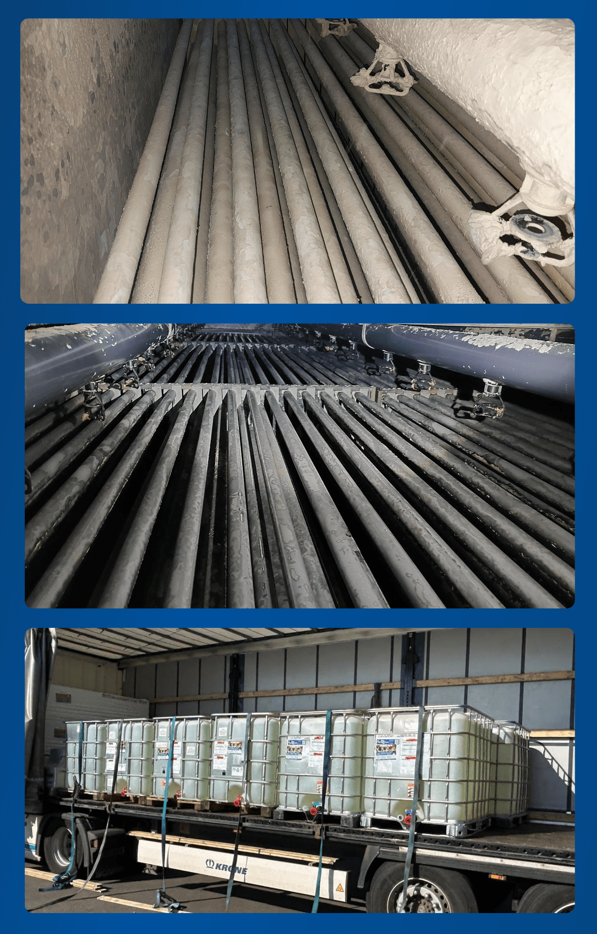 En raison du degré extrême d’encrassement, le nettoyage a dû être effectué en plusieurs phases, avec des temps de circulation prolongés pour décomposer le tartre dur et stratifié. À la fin du projet, un total de dix-neuf (19) conteneurs IBC de 1 000 litres de ScaleBreak-MP ont été utilisés pour restaurer les tubes à un état quasi original – sans causer de dommages aux faisceaux d’acier galvanisé ou à d’autres composants critiques du condenseur.